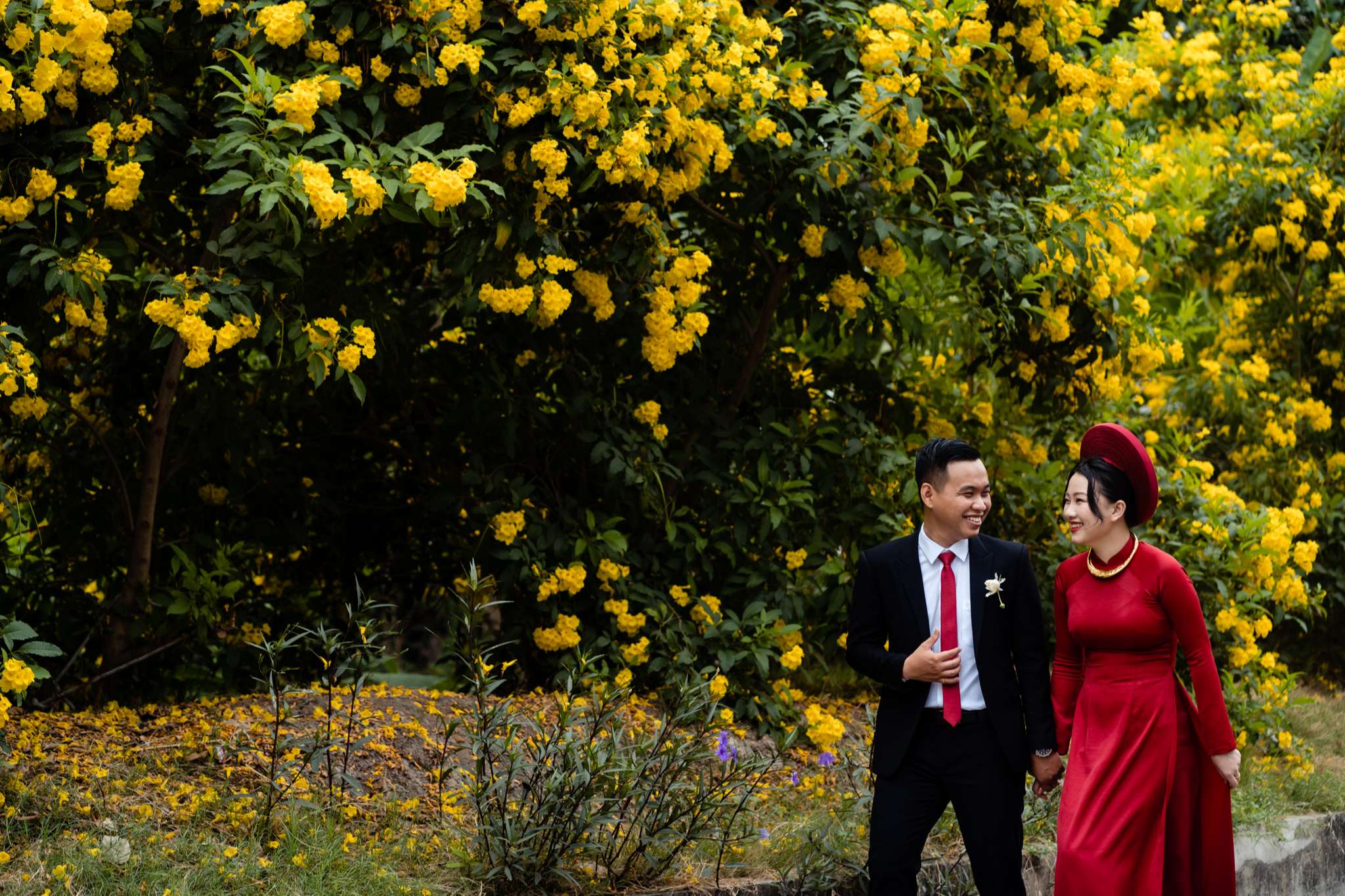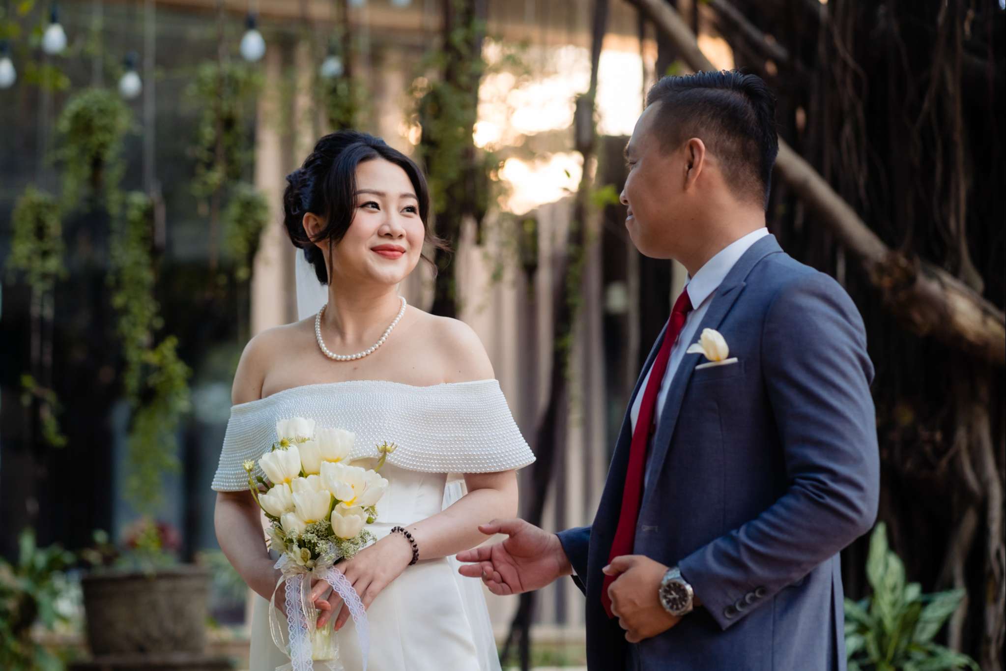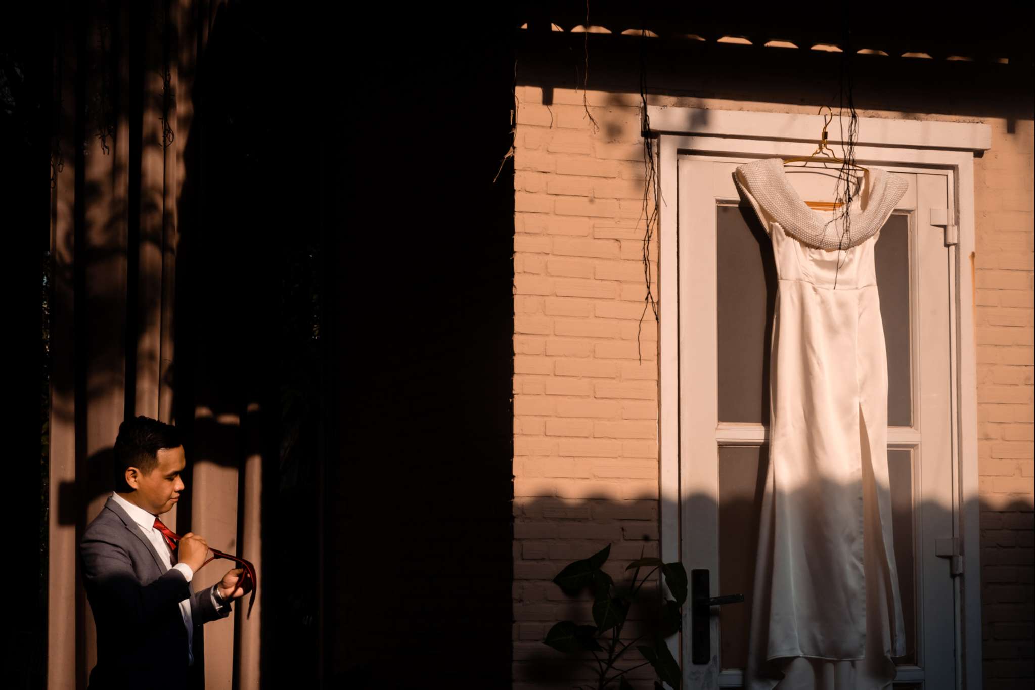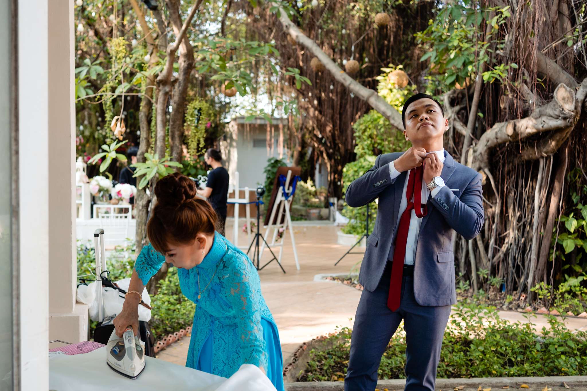 Buổi chiều Hà đãi tiệc trên nhà hàng Le Jardin, team tụi mình đến sớm hơn. Hôm đó nắng đẹp, vạt nắng vắt chiều màu vàng mật, vắt ngang trên bức tường dưới gốc cây si. Chiếc áo dài được Mẹ của Hưng ủi rất tỉ mỉ và chăm chút. Hà ngồi make up trong phòng, Hưng đang chuẩn bị cho mình từ cravat với áo vest. Mọi thứ được chuẩn bị thật chỉn chu cho buổi tối trọng đại của Hà và Hưng.