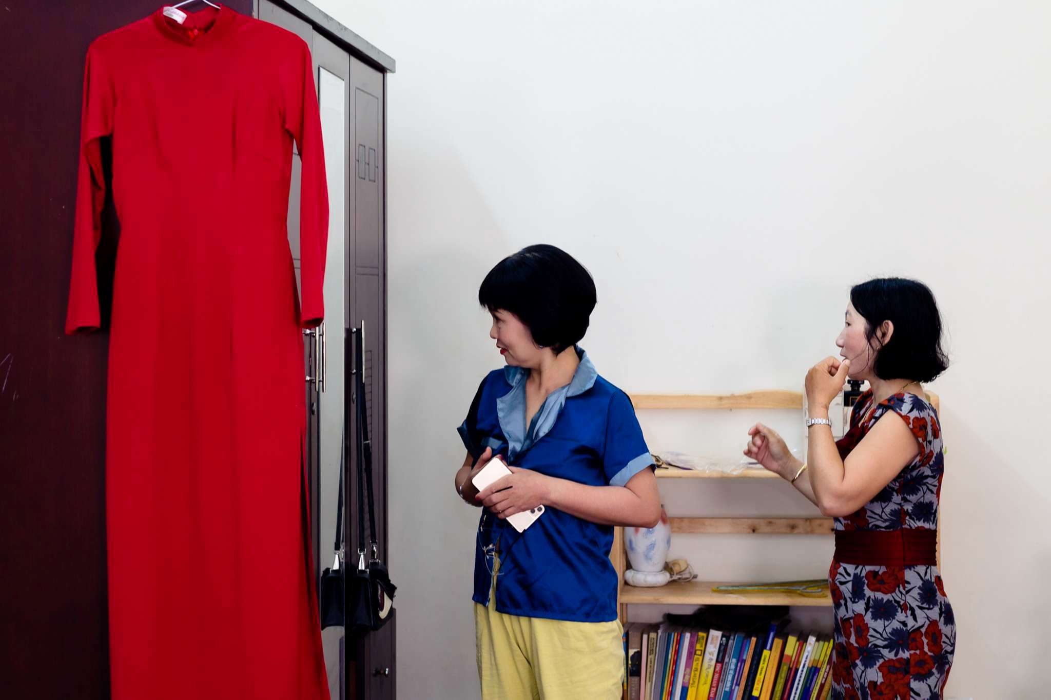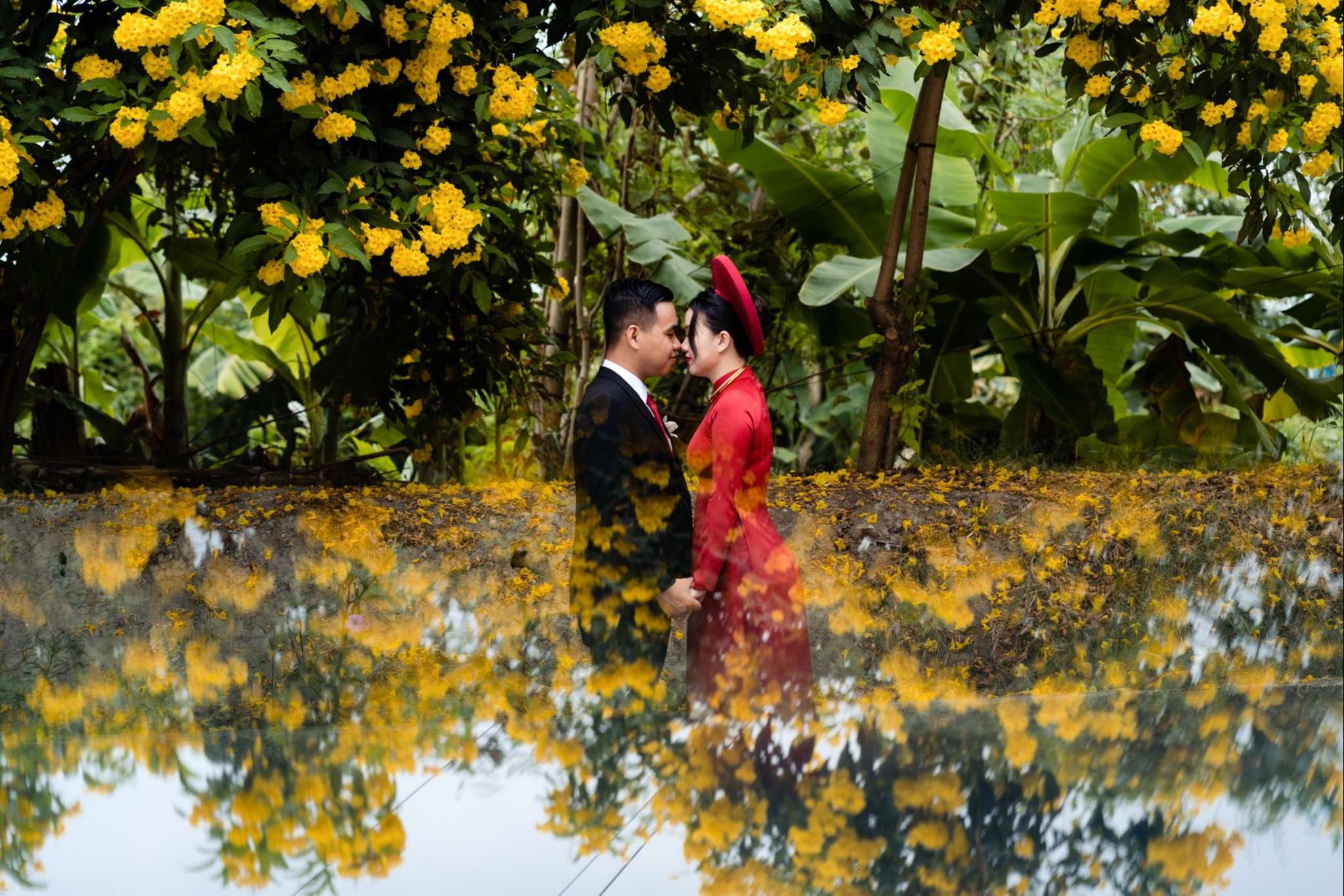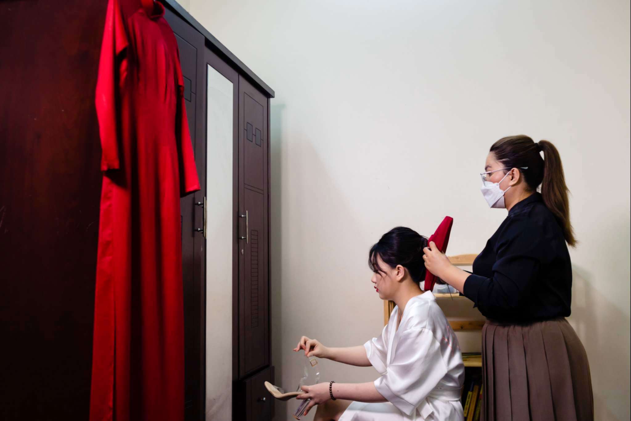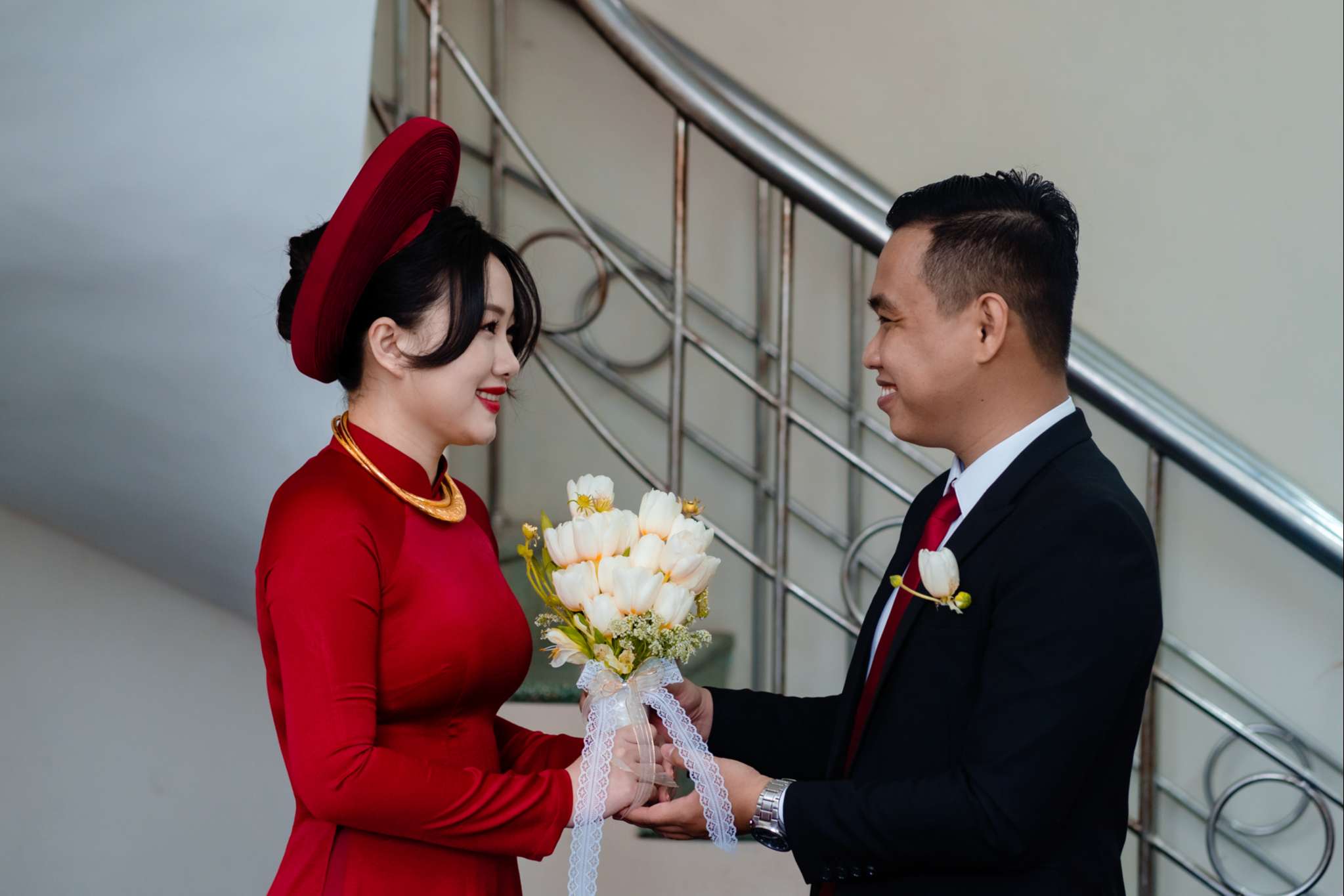 Buổi chiều Hà đãi tiệc trên nhà hàng Le Jardin, team tụi mình đến sớm hơn. Hôm đó nắng đẹp, vạt nắng vắt chiều màu vàng mật, vắt ngang trên bức tường dưới gốc cây si. Chiếc áo dài được Mẹ của Hưng ủi rất tỉ mỉ và chăm chút. Hà ngồi make up trong phòng, Hưng đang chuẩn bị cho mình từ cravat với áo vest. Mọi thứ được chuẩn bị thật chỉn chu cho buổi tối trọng đại của Hà và Hưng.