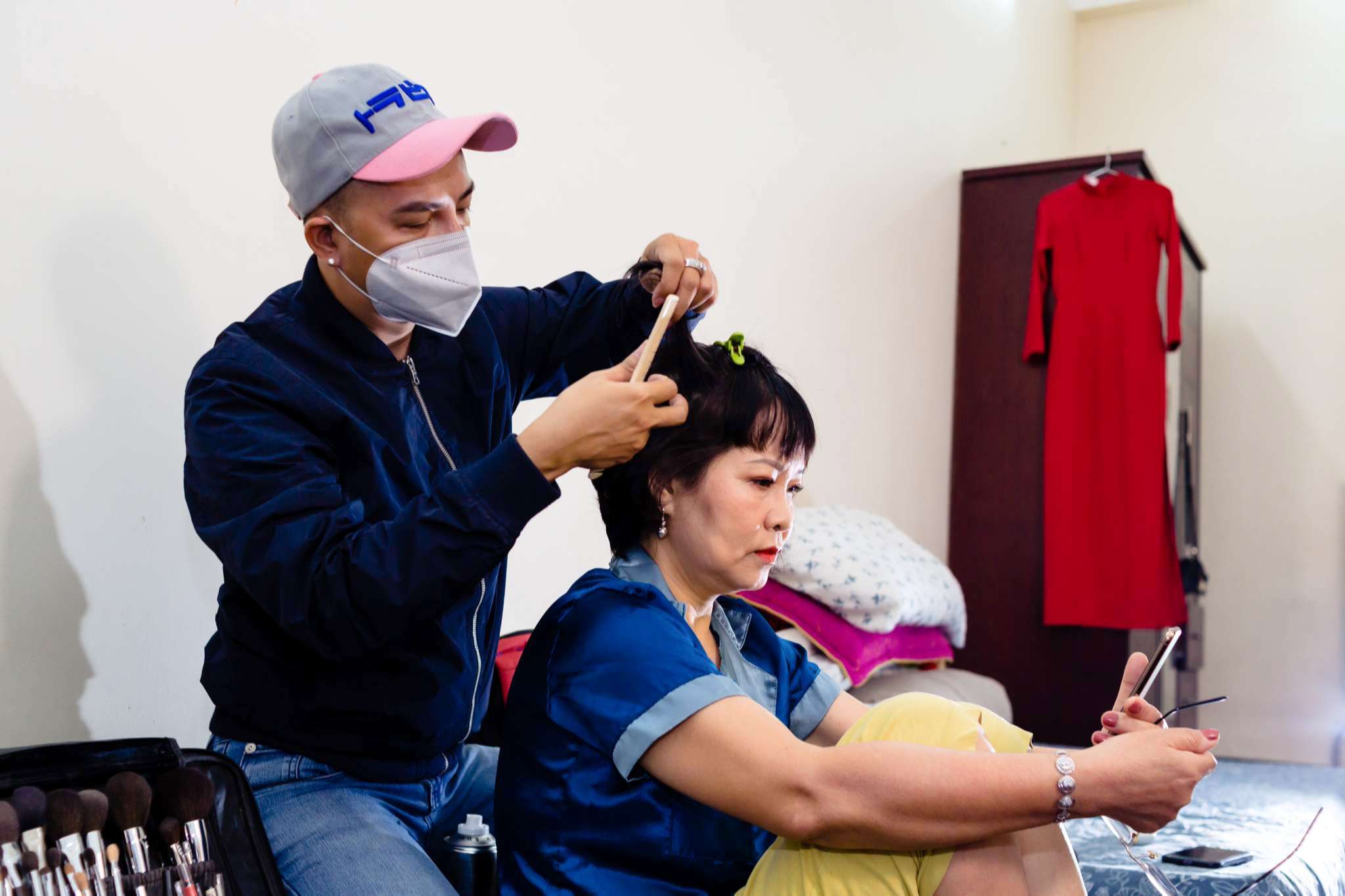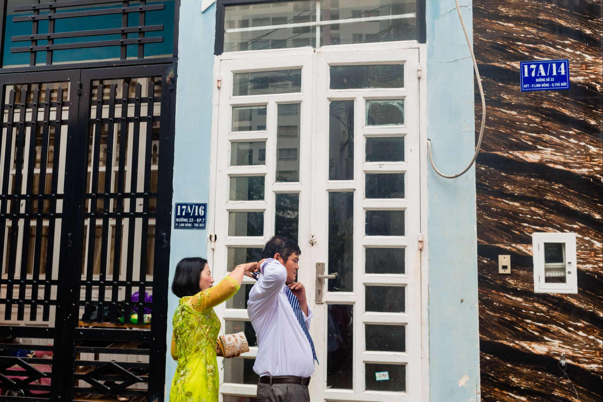 Đấy là mình, còn anh Trường chụp bên nhà chú rể – anh Hưng. Tối hôm trước mình nhắn cho anh Trường bảo địa chỉ nhà chú rể định vị ngay Gigamall Phạm Văn Đồng. Ổng tin mình rồi không search lại luôn, sáng cứ thế ung dung mà đi … lạc. Gần 7h sáng phải nhờ tới anh Thông (cameramen) tới trước gửi định vị. Lần này là sai cái phường, không còn “cũ” nữa.